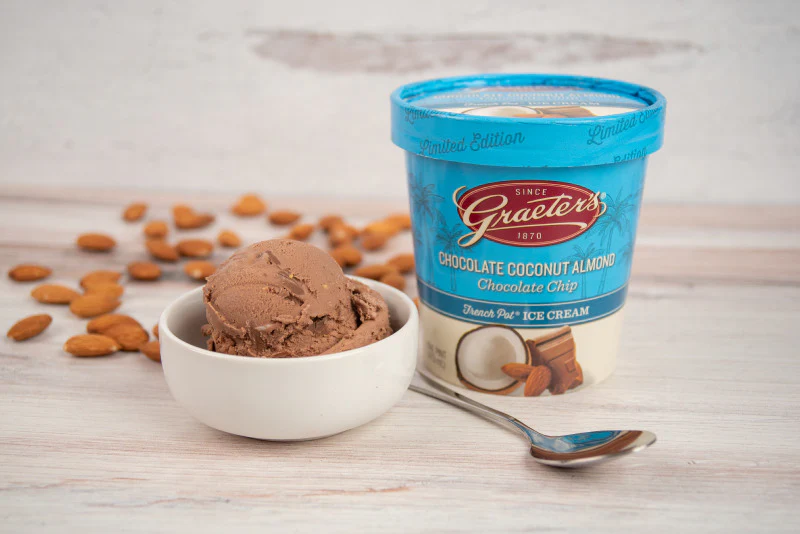Our Chocolate Coconut Almond Chocolate Chip blends chocolate ice cream with coconut, almonds, and milk chocolate chips.